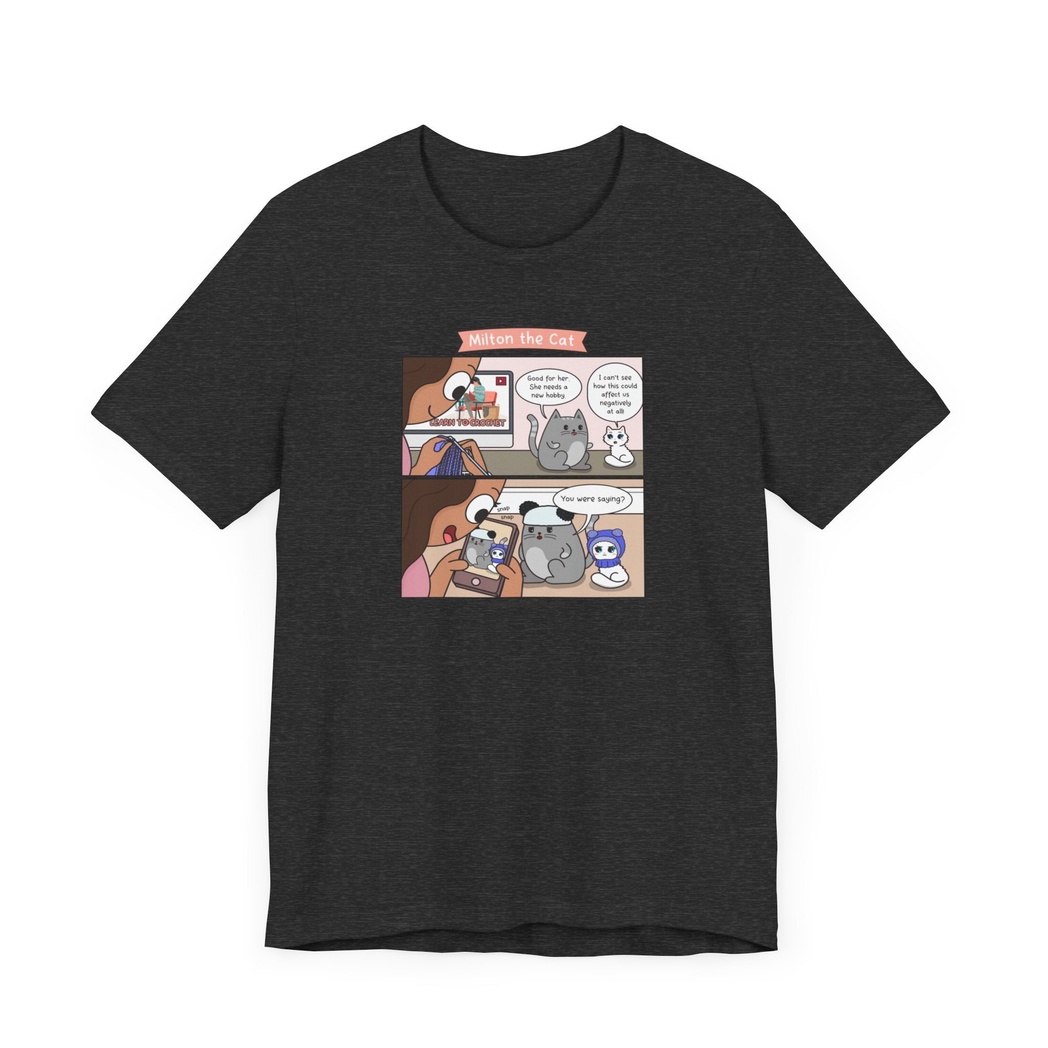 Whether you're lounging at home, running errands, or hanging out with friends, this versatile unisex tee is the perfect addition to any casual outfit. With a comfortable fit and a design that exudes personality, the Kitty Cat Crochet Comic T-Shirt is sure to become a wardrobe favorite for cat lovers of all ages.