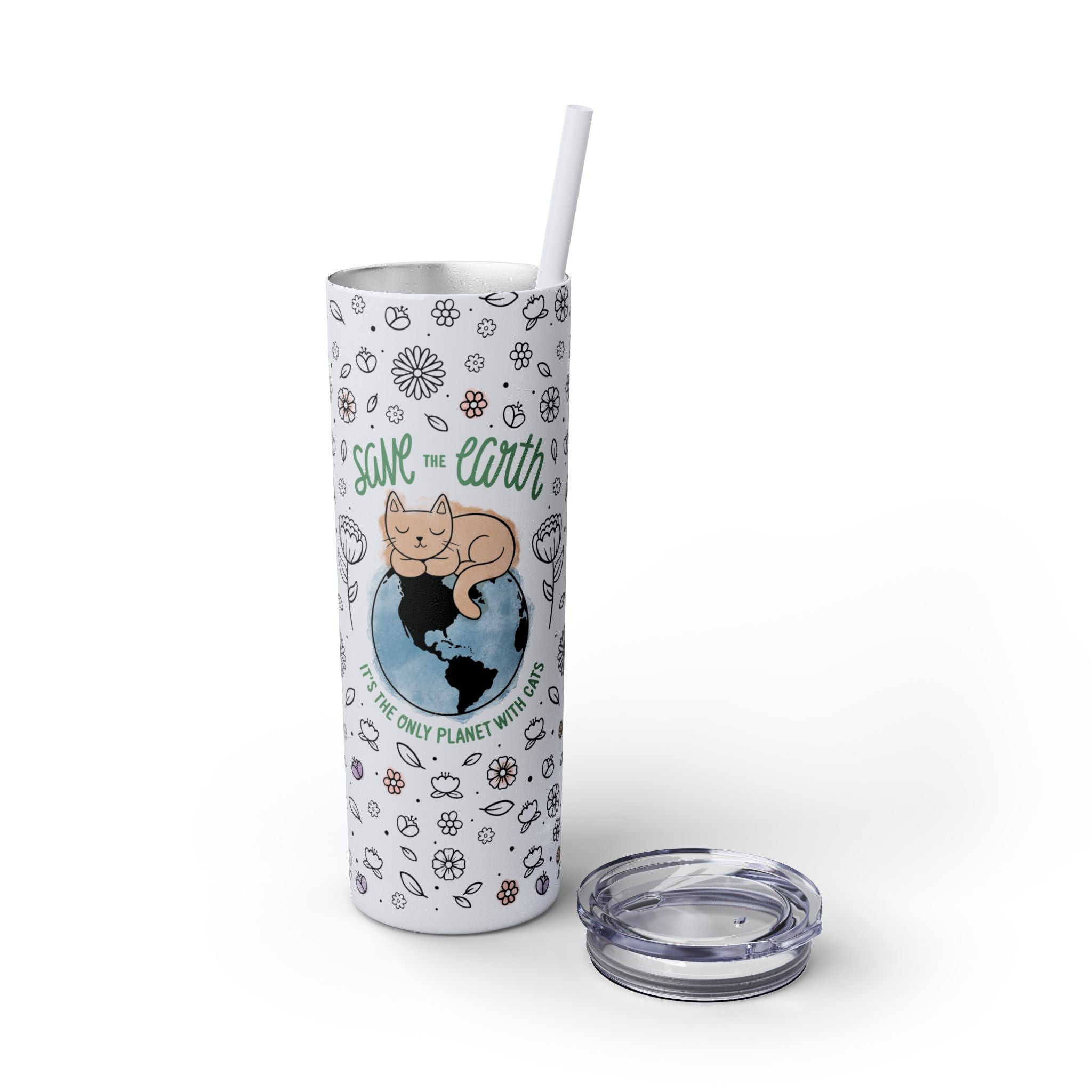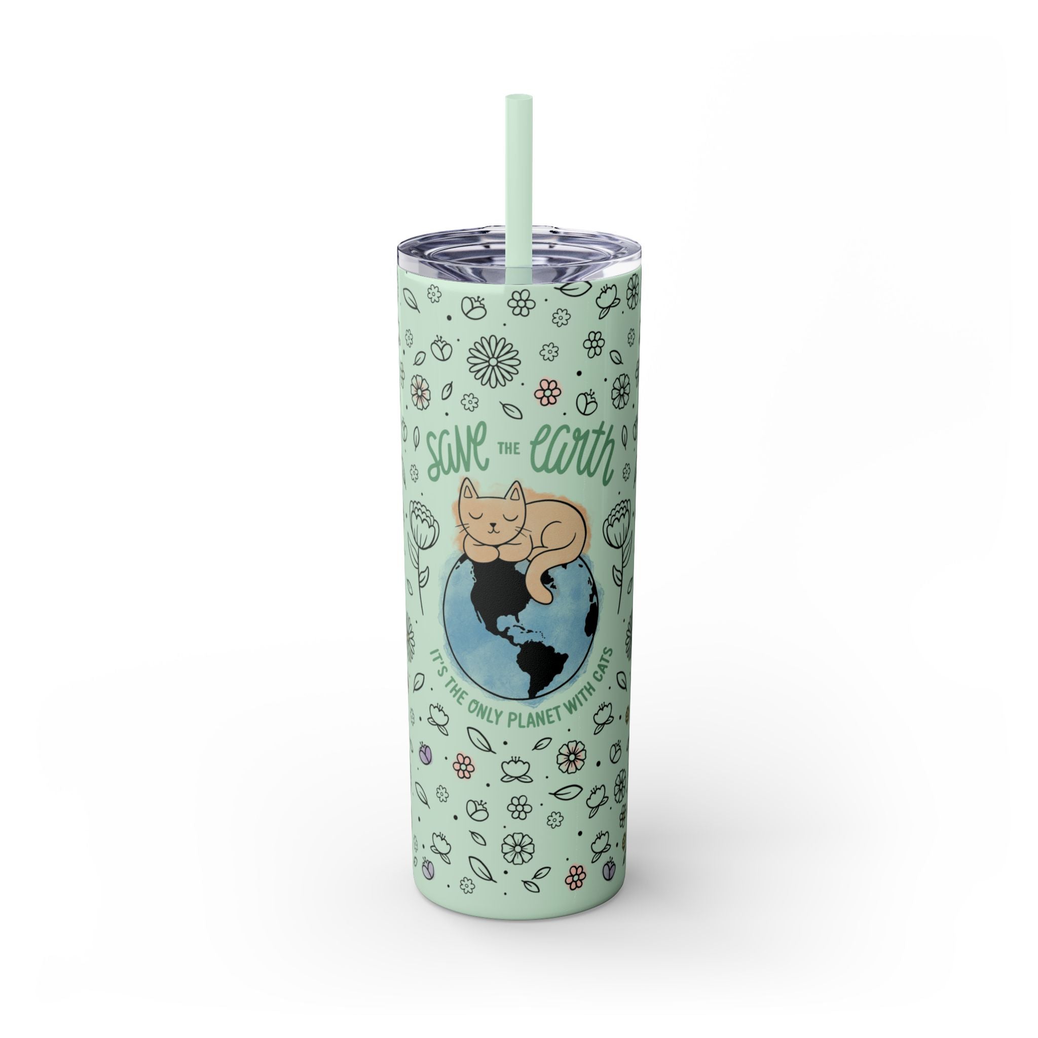 This reusable stainless steel tumbler features our signature quote, “Save the Earth: It’s the Only Planet with Cats,” set against a whimsical floral pattern and soft pastel watercolor accents. The glossy glitter finish adds a sparkling touch that catches the light and turns heads wherever you go.
